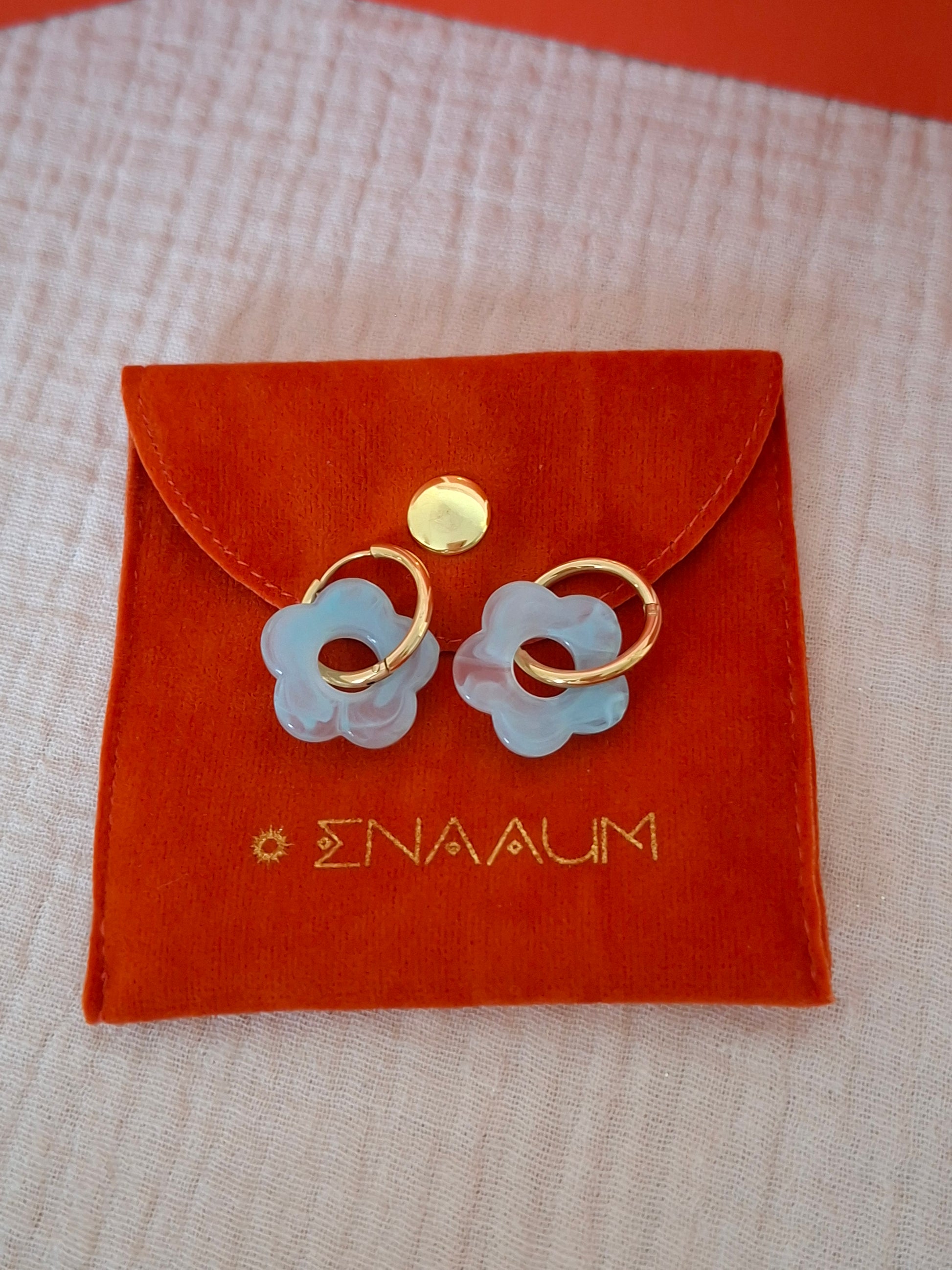 Chaque paire est composée d’un anneau en acier inoxydable doré, résistant à l’eau et au temps, associé à un pendentif fleur en résine brillante.