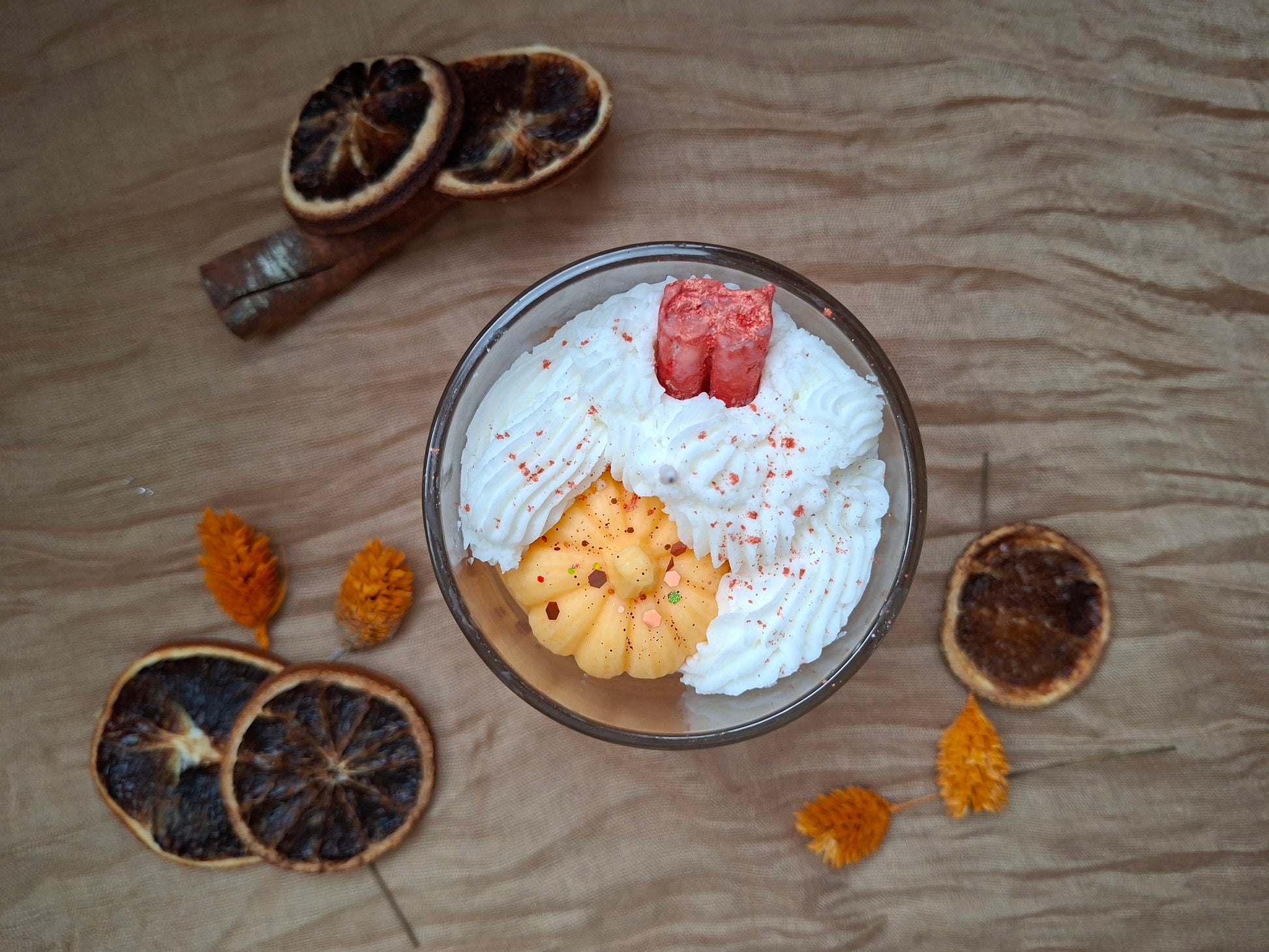 Gel parafine. Pigments orange. Chantilly cire de Soja végétale sans OGM. Cire de soja, décoration en cire de soja végétale sans OGM. Parfum de grasse garantie sans CMR ni Phtalates. Mèche en coton. Non-testé sur les animaux. Contenant réutilisable.