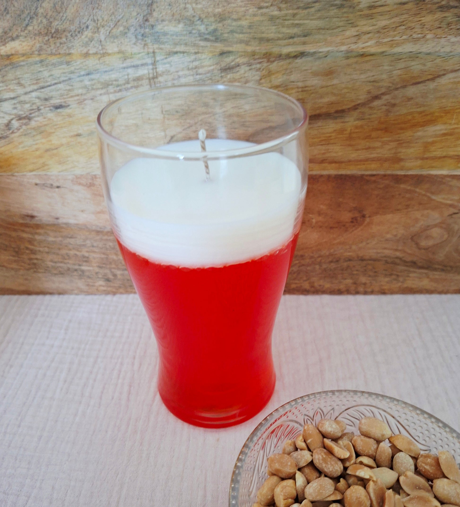 Sa base en gel transparent reproduit parfaitement l’effet d’une bière fraîche, tandis que la mousse en cire de soja est travaillée avec soin pour imiter la crème légère d’une pinte tout juste servie. Pour parfaire l’illusion, la bougie est délicatement parfumée à la bière, ajoutant une touche authentique et surprenante.