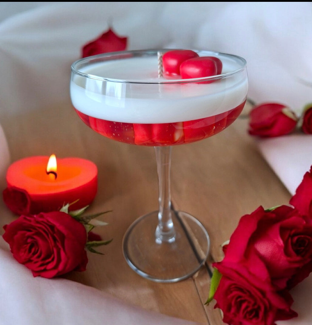 ❤️Délicate et raffinée, cette bougie coulée dans un verre à champagne associe la transparence du gel paraffine à la douceur de la cire de soja. Les cœurs rouges apportent une touche romantique et symbolisent l’amour et la passion. Une création lumineuse et originale, parfaite pour sublimer une table ou offrir un moment d’exception.
