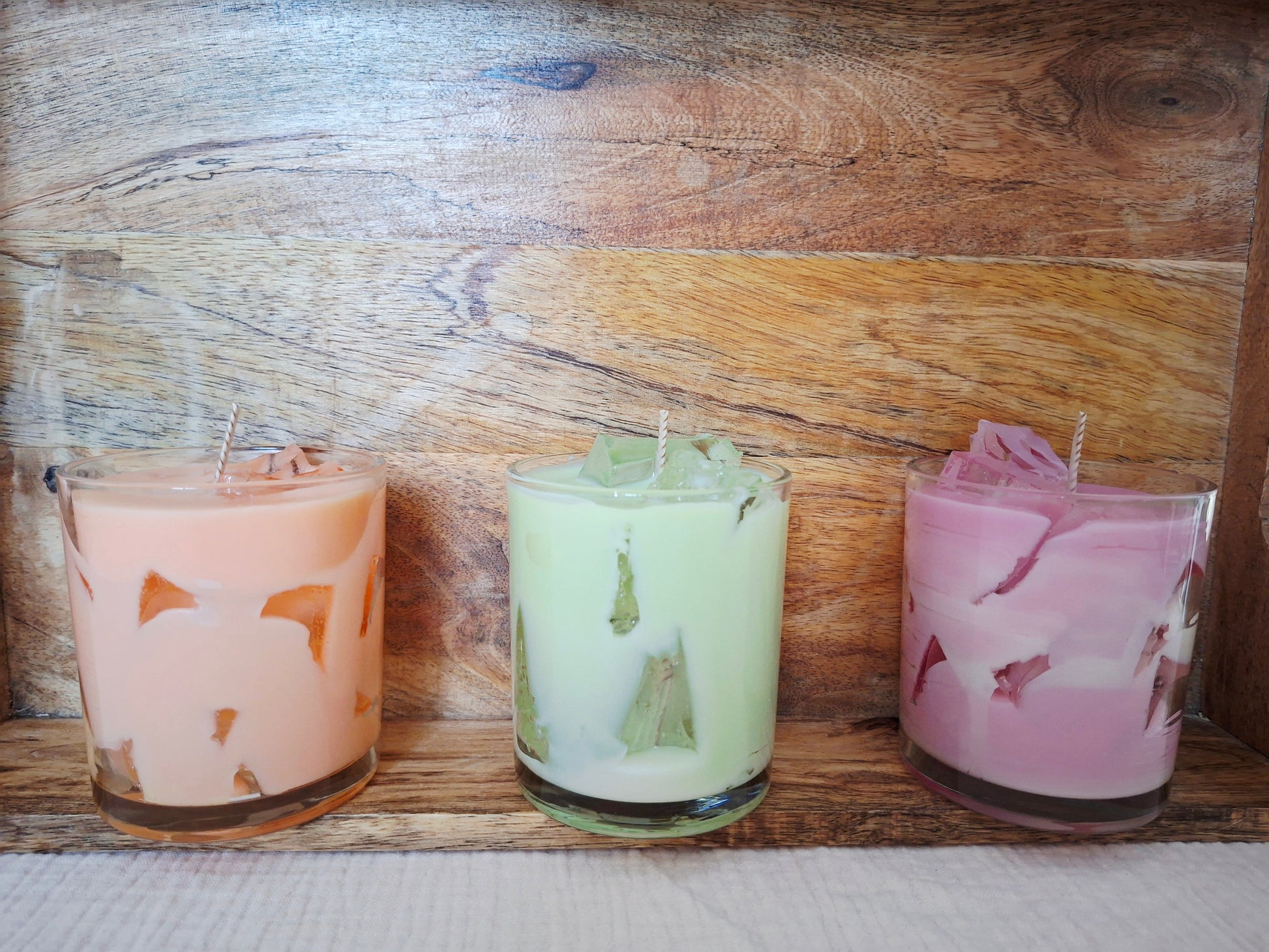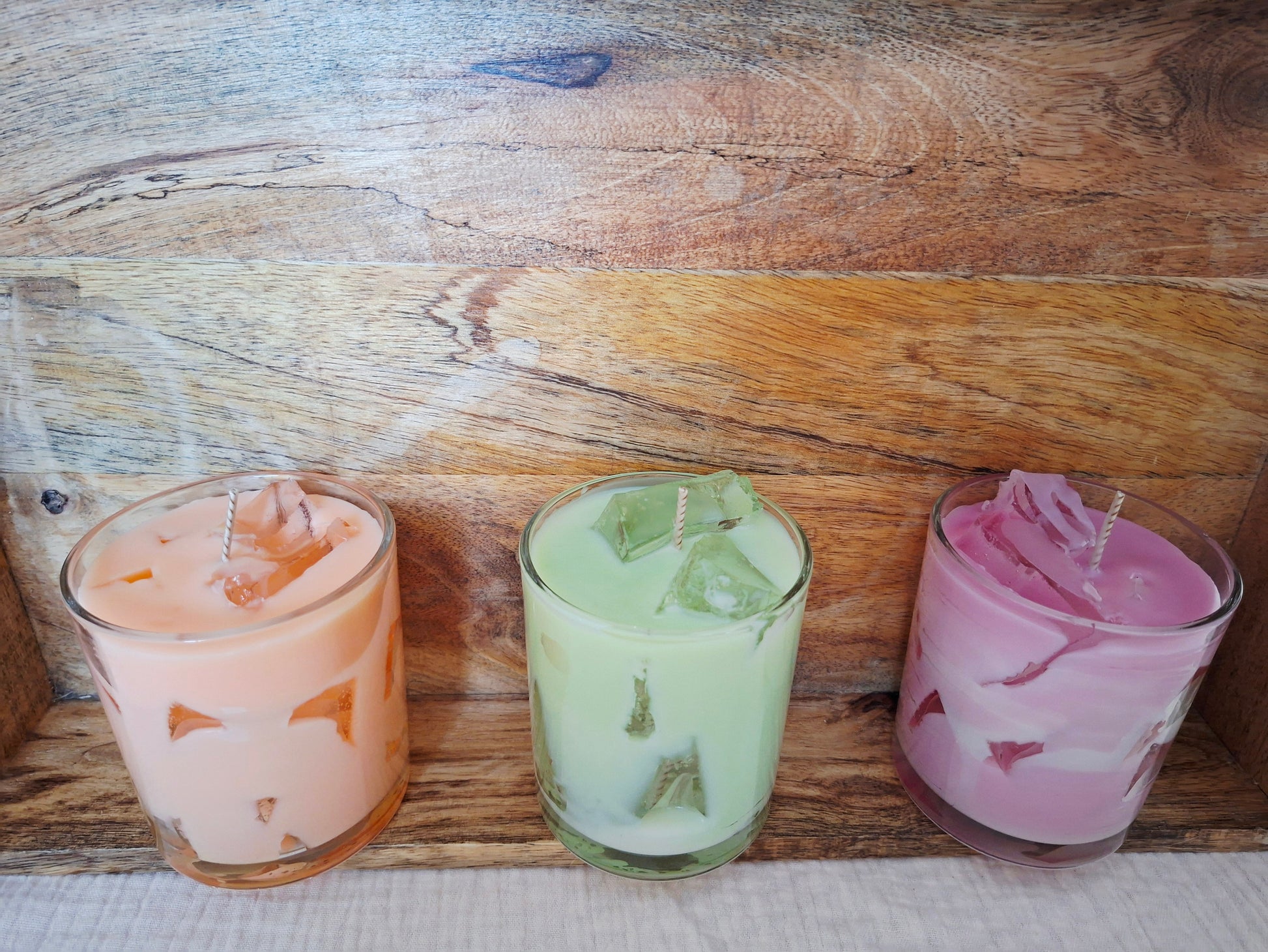 Façonnées en cire de soja et rehaussées d’un gel de paraffine lumineux, elles diffusent leurs arômes avec une élégance calme, comme trois petites gourmandises qui parfument l’air sans jamais l’alourdir.