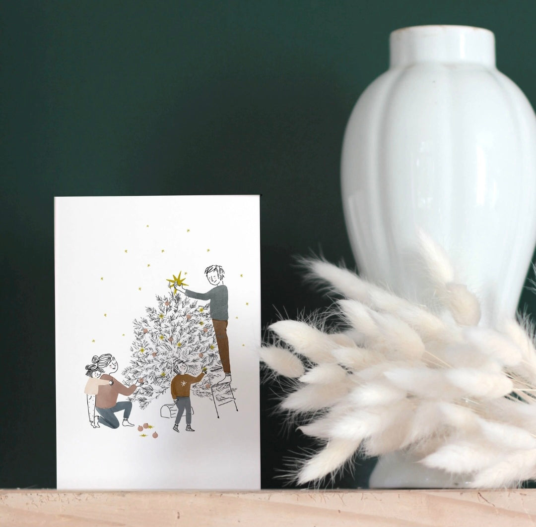 🎄Cette charmante carte illustre une famille réunie autour du sapin de Noël, partageant un moment chaleureux et rempli de magie. Une scène festive qui transmet instantanément l’esprit des fêtes et la joie des instants partagés.
