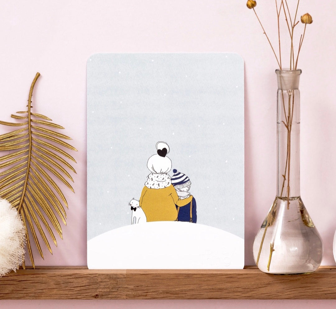 👩👦Carte « Maman et Fils » – Vue arrière d’une maman en manteau jaune et de son fils avec bonnet rayé bleu et blanc, partageant un moment tendre.❄️