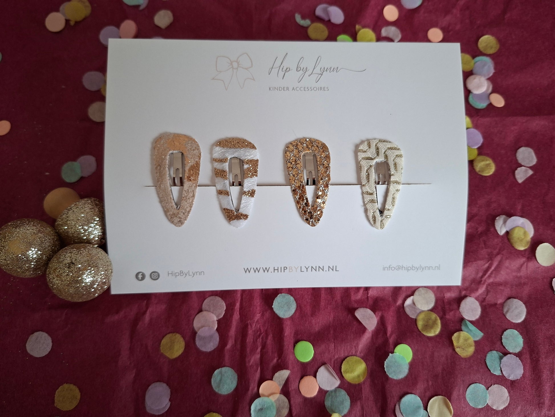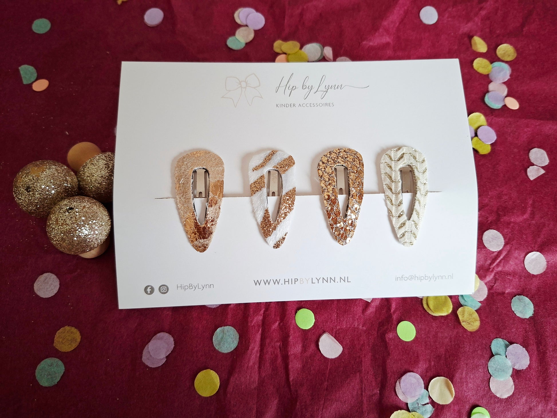✨ Set de 4 barrettes clic-clac Amy en tons dorés, disponibles en 3 et 4 cm. Parfaites pour sublimer les coiffures de vos princesses, du chignon élégant aux mèches rebelle, elles ajoutent une touche rayonnante à chaque look.