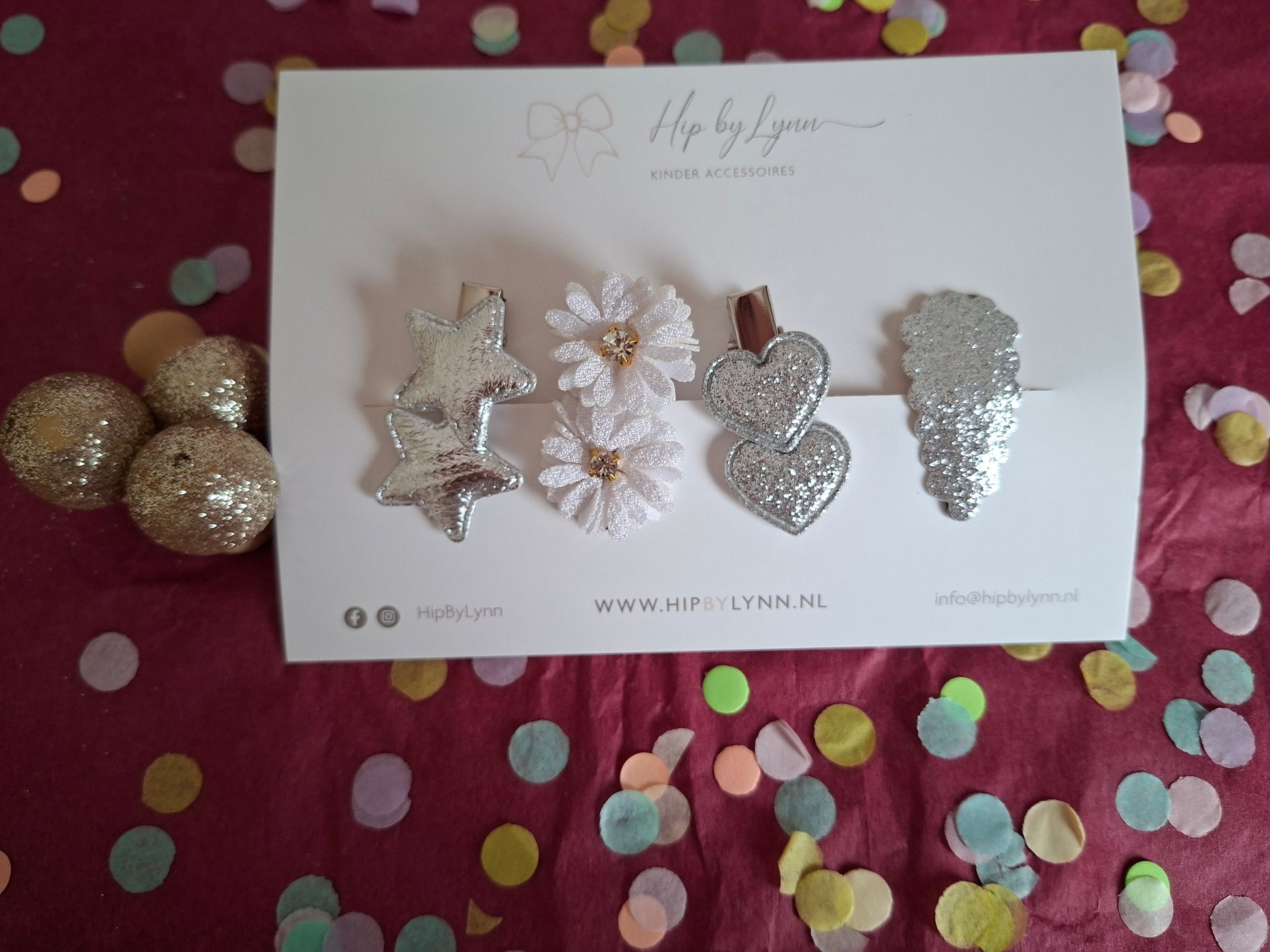 ✨ Ensemble de 4 barrettes pour enfants, parfait pour Noël ou les fêtes d’hiver. Argent, blanc et paillettes apportent élégance et fantaisie à chaque coiffure.