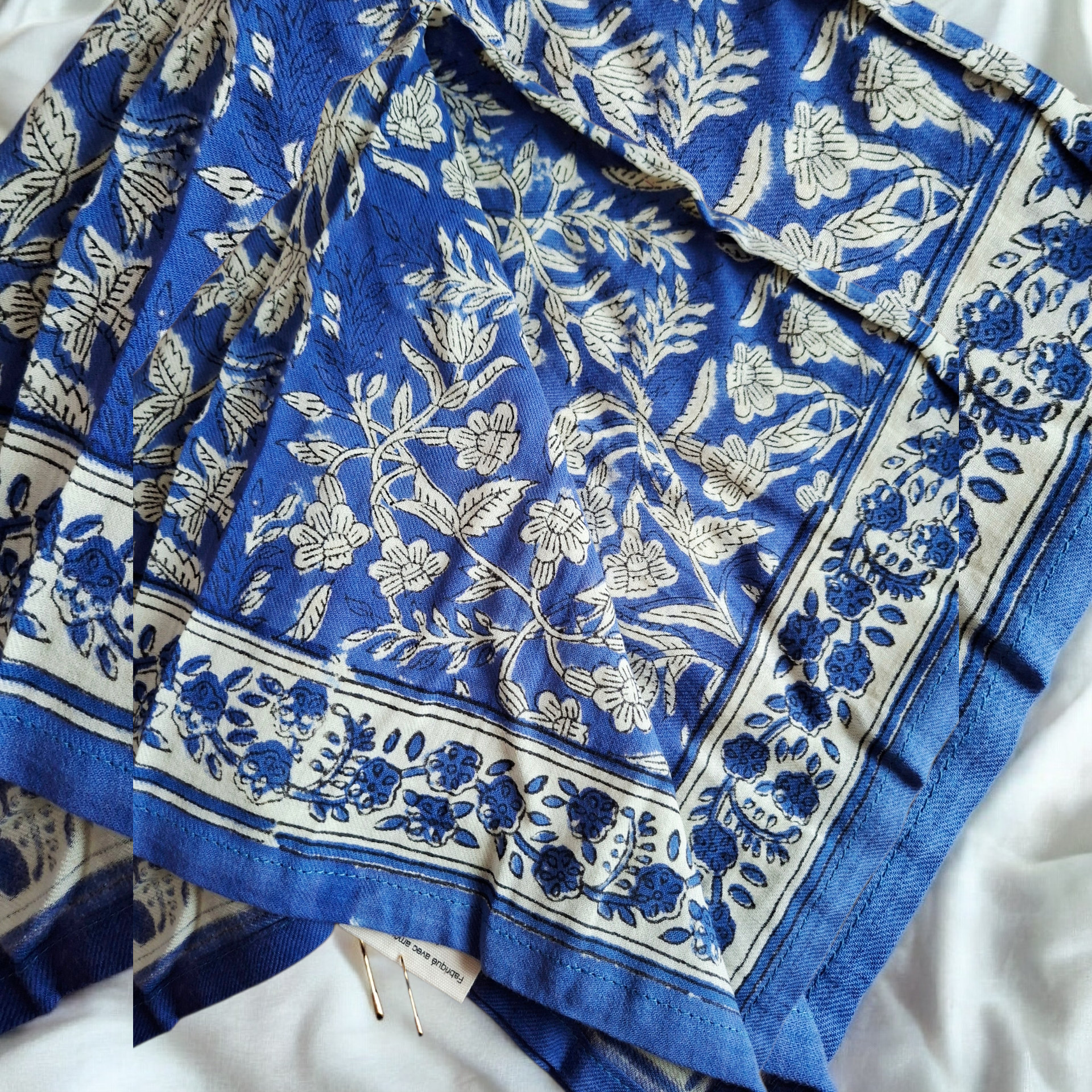 💙Pensé pour les enfants (50 × 50 cm), ce foulard léger et pratique se porte autour du cou, dans les cheveux ou accroché à un sac. Imprimé artisanalement à Jaipur avec la technique du block print, chaque pièce est unique, avec de petites variations de couleurs qui font tout son charme.💙