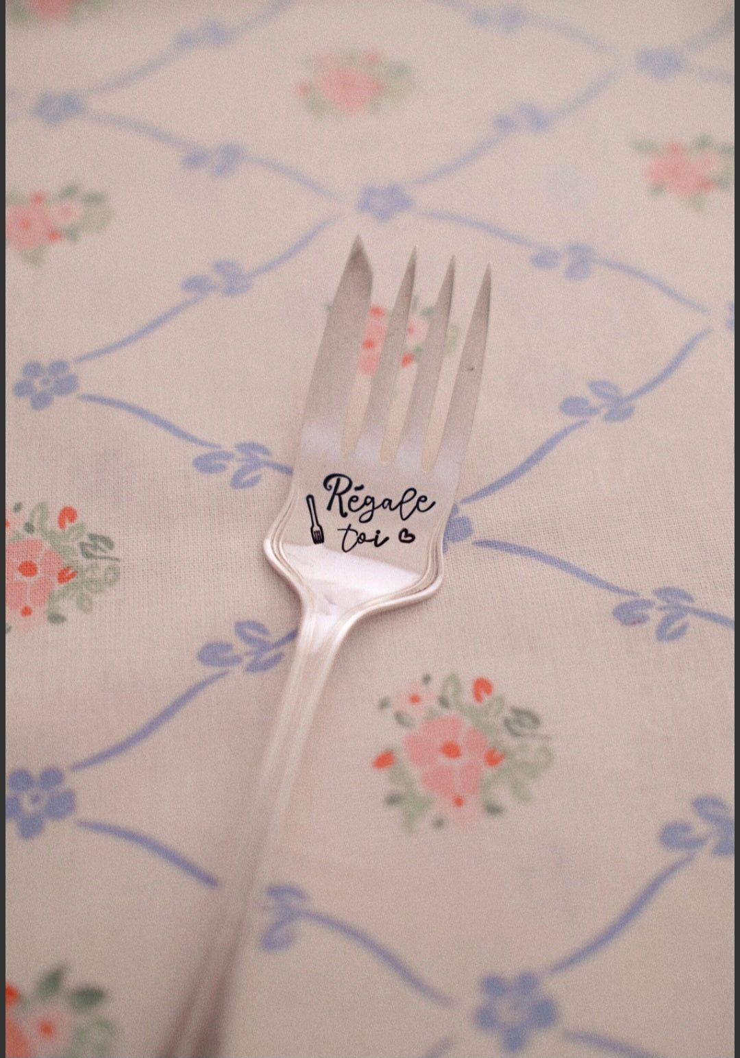💕Offrez vous un moment gourmand avec cette fourchette à dessert, délicatement gravée à la main du message « Régale-toi ». Une pièce vintage pleine de caractère et de douceur, idéale pour accompagner vos instants sucrés avec une note poétique.