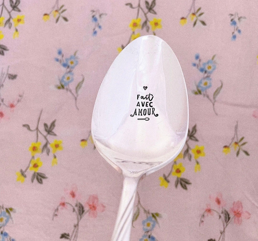 Ajoutez une pointe d’authenticité à vos instants gourmands avec cette grande cuillère vintage, délicatement gravée à la main du message « fait avec amour ». Une pièce unique, empreinte d’histoire, idéale pour sublimer une préparation maison ou offrir un cadeau plein de douceur et de sens.