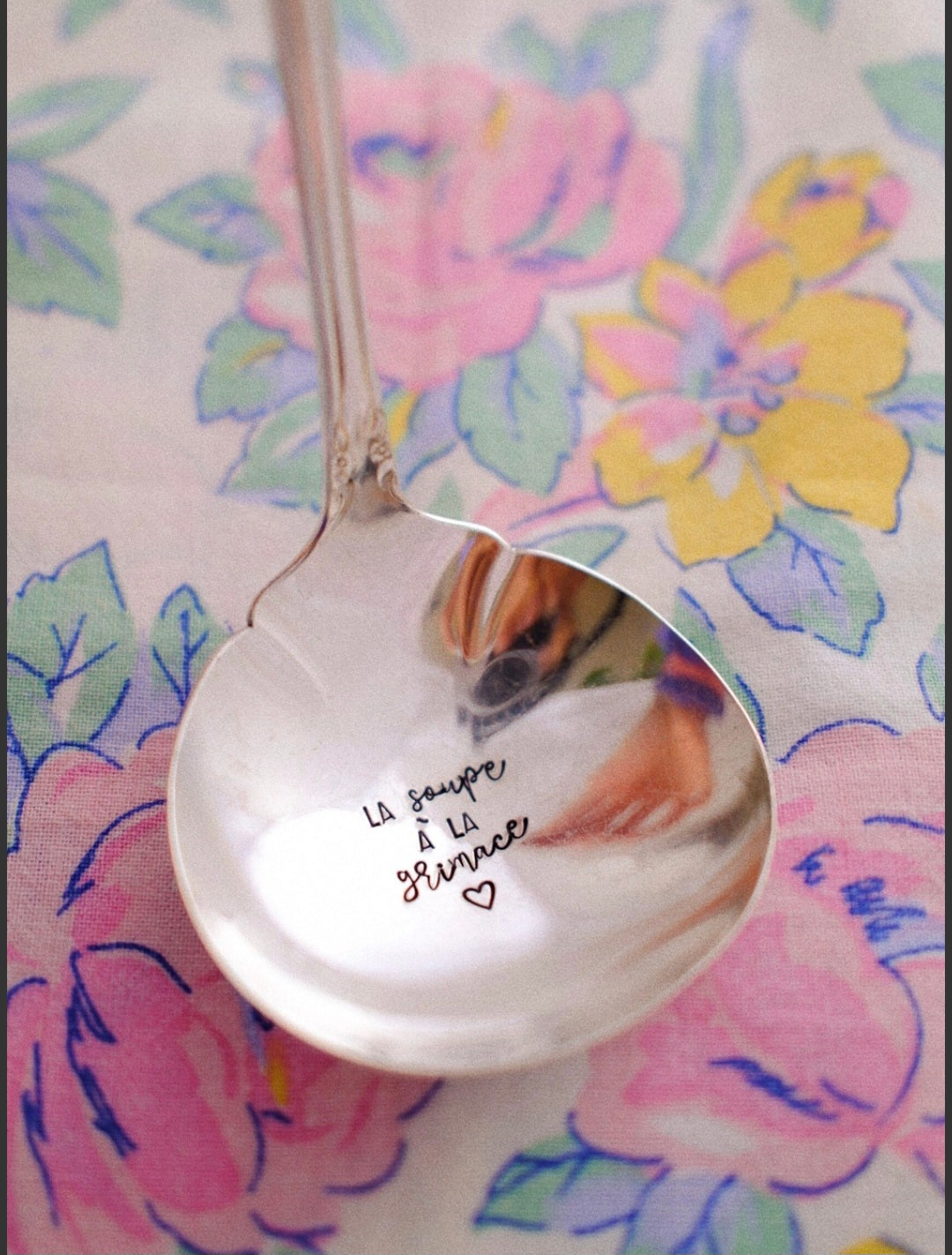Une note malicieusement gourmande à la table avec cette petite louche vintage, gravée à la main du message « La soupe à la grimace ». Une création unique qui marie authenticité et humour, parfaite pour pimenter vos repas d’une pointe de second degré.